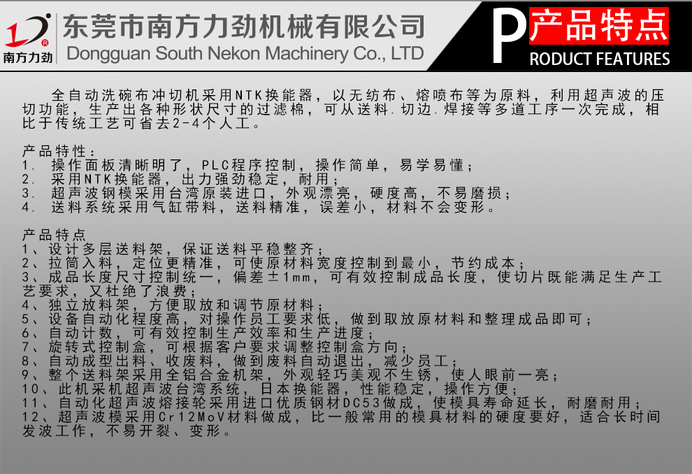 10、此機采機超聲波臺灣系統,日本換能器,性能穩定,操作方便;11、自動化超聲波熔接輪采用進口優質鋼材DC53做成,使模具壽命延長,耐磨耐用;